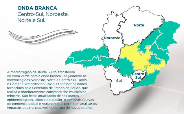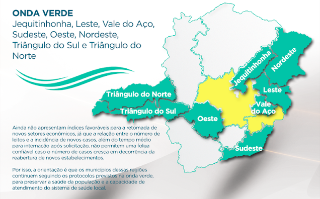 As regiões Nordeste, Jequitinhonha, Leste, Vale do Aço, Sudeste, Oeste, Triângulo do Sul e Triângulo do Norte ainda não apresentam índices favoráveis para a retomada de novos setores econômicos, já que a relação entre o número de leitos e a incidência de novos casos, além do tempo médio para internação após solicitação, não permitem uma folga confiável se o número de casos crescer em decorrência da reabertura de novos estabelecimentos.
