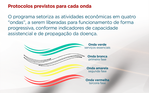 O Minas Consciente setoriza as atividades econômicas em quatro “ondas”, a serem liberadas para funcionamento de forma progressiva, conforme indicadores de capacidade assistencial e de propagação da doença.